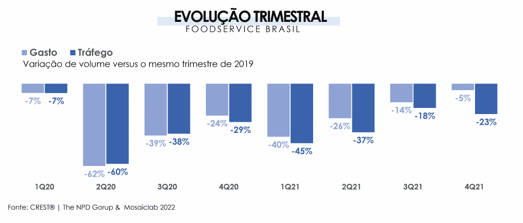 Apesar do contexto, o setor mostrou uma forte recuperação no ano: em 2021 o gasto cresceu 18% em relação ao ano anterior, sustentado pelo aumento de 5% do tráfego e de 12% do ticket médio por consumidor, segundo o CREST, pesquisa global do mercado de foodservice do The NPD Group realizada no Brasil em parceria com a Mosaiclab.
