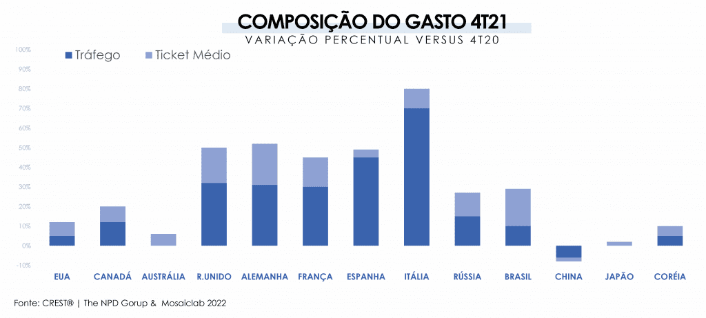 No quarto trimestre de 2021, todos os mercados mostraram crescimento de tráfego e ticket médio e, por consequência, o gasto nos mercados cresceu, com exceção da Austrália e, principalmente, da China, onde severas restrições haviam sido impostas em diferentes grandes cidades por conta de novos surtos de covid-19. Vale ressaltar o desempenho positivo generalizado na Europa, em todos os países analisados.