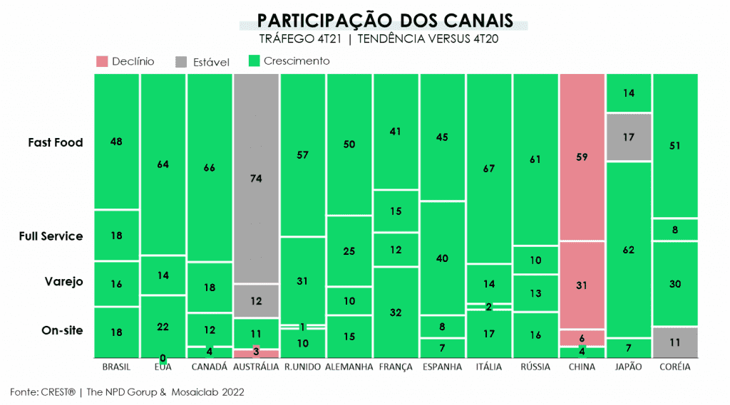 Analisando os diferentes segmentos, no geral todos cresceram no quarto trimestre de 2021 nos diferentes países, destacando-se a recuperação do Quick-Service Restaurant (QSR) e do Full Service na Europa, Estados Unidos e Brasil. Dayparts crescem de forma generalizada nos mercados também, mas no geral estão ainda abaixo dos níveis do final de 2019 em termos de tráfego, reforçando o desafio da geração e aumento do volume de visitas no setor, nas diferentes ocasiões de consumo.