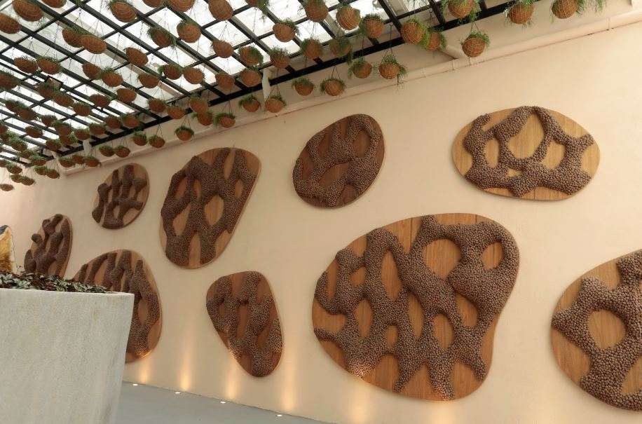 A dupla ainda desenvolveu um jardim suspenso ao incorporar a natureza ao ambiente interno. Para isso, diversos vasos com plantas nativas da biodiversidade brasileira foram dispostos no telhado do espaço. Ao longo do tempo, as plantas formarão uma nuvem verde que cobrirá toda a extensão do lugar.
