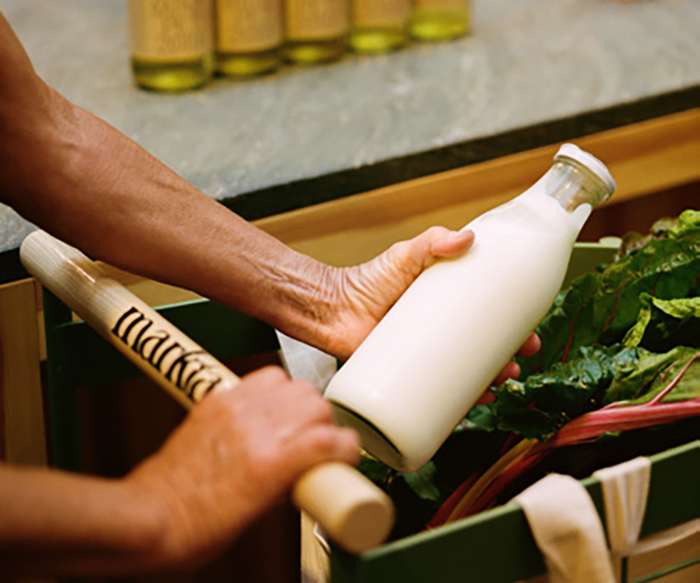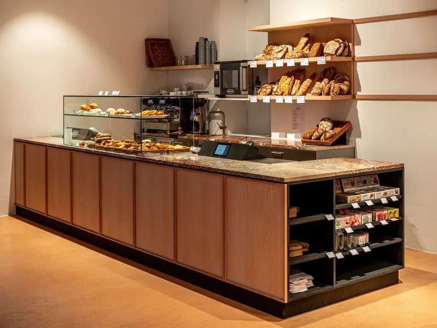 A loja também oferece experiências interativas, como degustações e workshops com fazendeiros. O design do local apresenta materiais de origem local, como pinho austríaco e elementos reciclados, bem como um layout aberto, semelhante a um mercado, e uma árvore central.