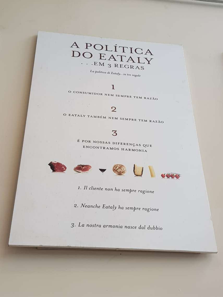 Em seu manifesto, exposto em banner gigante na entrada da loja, o Eataly propõe explicitamente uma relação mais harmoniosa com seus clientes.