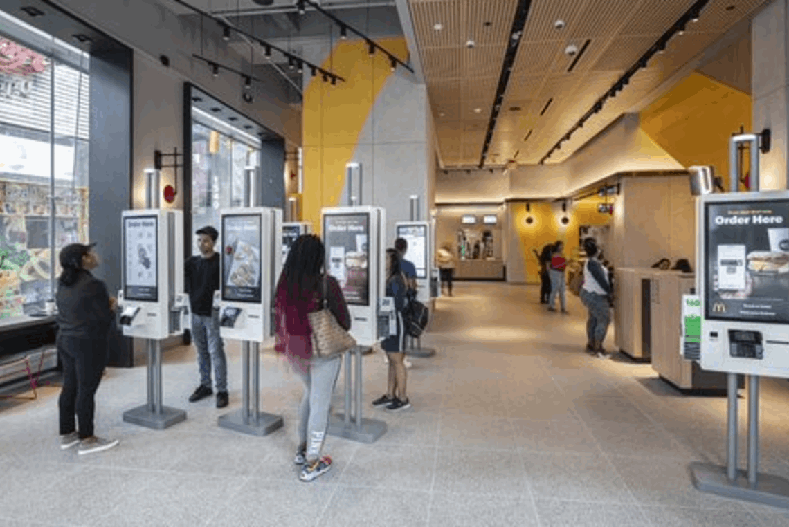 Quando os clientes entram no local, a visão dos quiosques de autoatendimento os recebem com “boas-vindas”. Os funcionários também estão disponíveis para realizar pedidos e pagamentos.