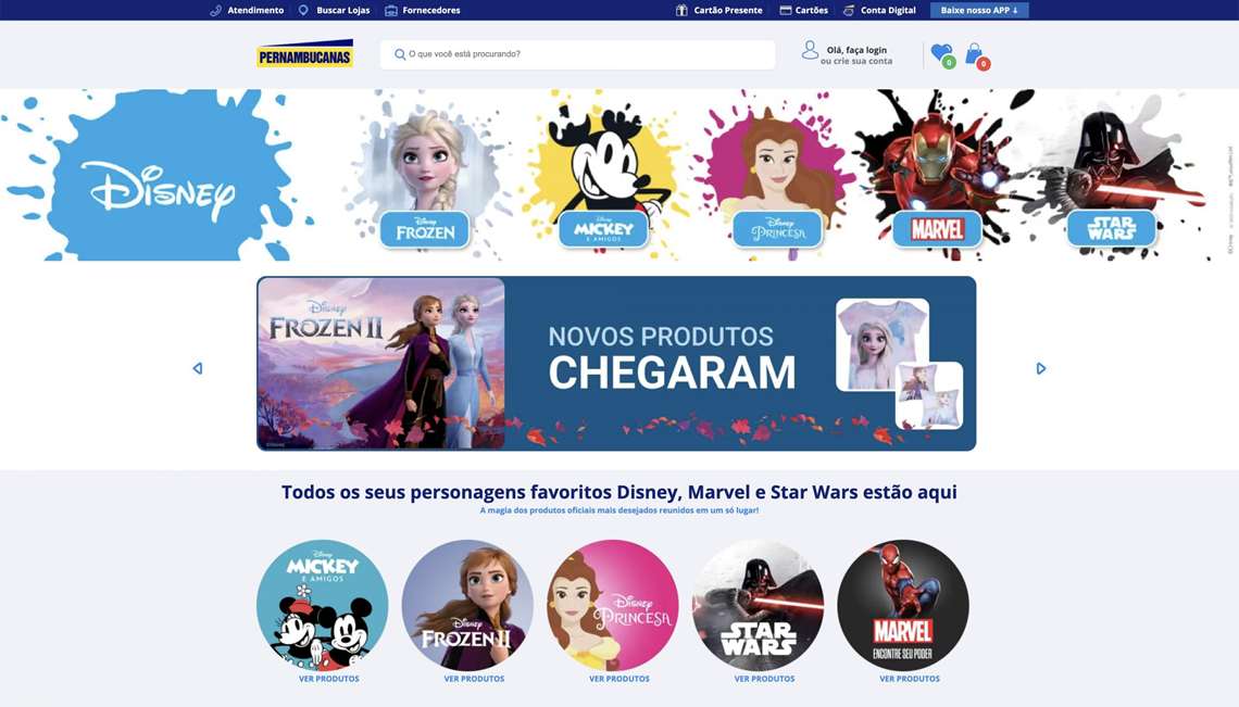 A Pernambucanas lança sua primeira seção online dedicada à Disney com produtos licenciados das franquias Mickey & Amigos, Disney Princesa, Frozen, Marvel e Star Wars. O cliente poderá explorar um local exclusivo dentro do site da Pernambucanas, totalmente temático de maneira prática, intuitiva e ambientada pela magia da Disney (clique aqui para acessar).