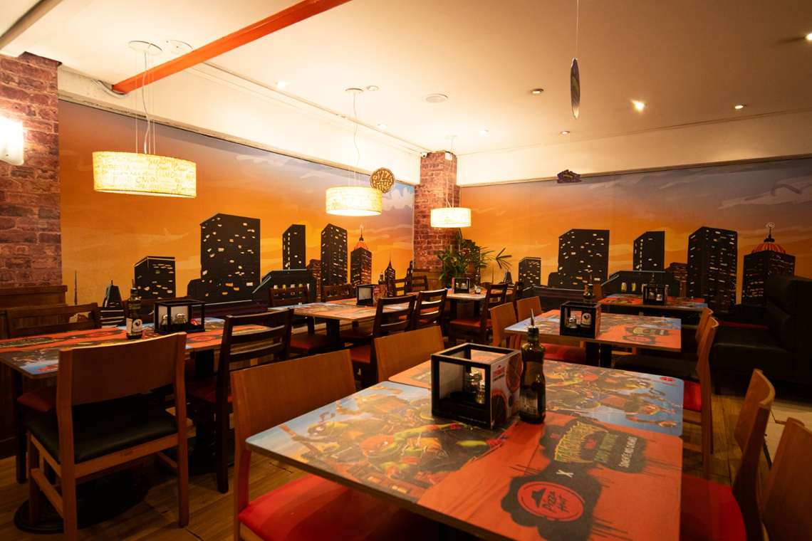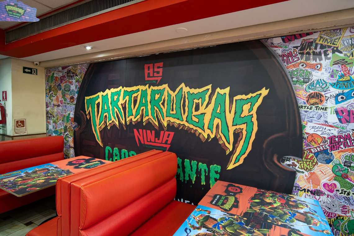 A loja incorpora todos os elementos do filme em diversos ambientes. Na fachada, os consumidores são recebidos com elementos visuais marcantes. A entrada do restaurante oferece uma experiência imersiva no universo das tartarugas, criando a sensação de entrar na casa delas. Além disso, a decoração das mesas adiciona um toque final de personalidade à unidade.