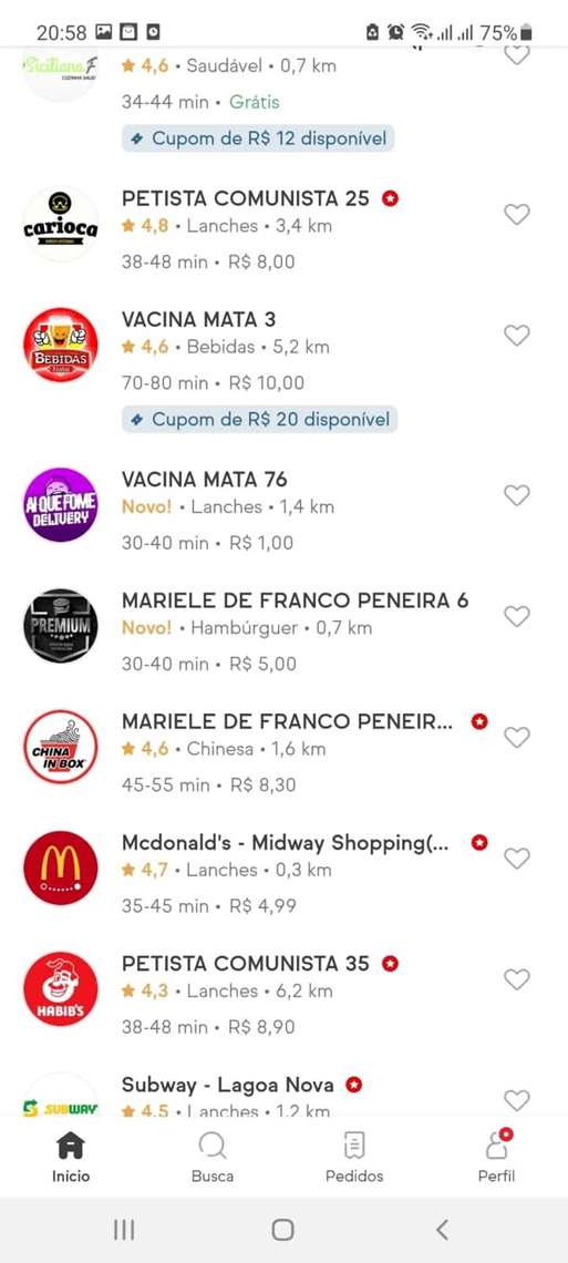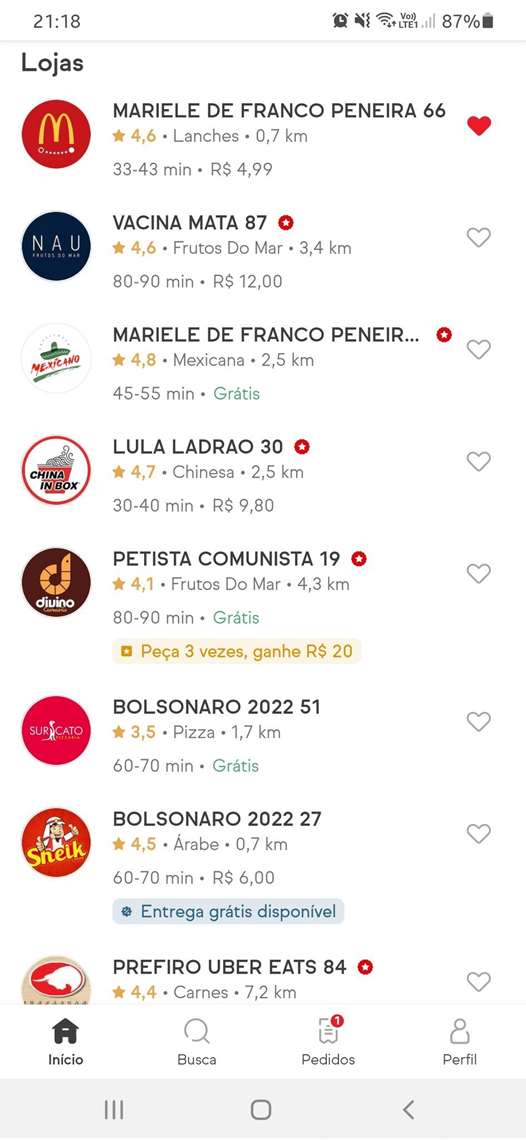 O aplicativo de delivery IFood teve, na noite de terça-feira, 2, nomes de restaurantes alterados para mensagens de ofensas políticas e antivacinas, além de apoio ao presidente Jair Bolsonaro. Dentre os nomes dos estabelecimentos alterados estão “Lula Ladrão”, “Bolsonaro 2022”, “Marielle de Franco Peneira” e “Vacina Mata”.