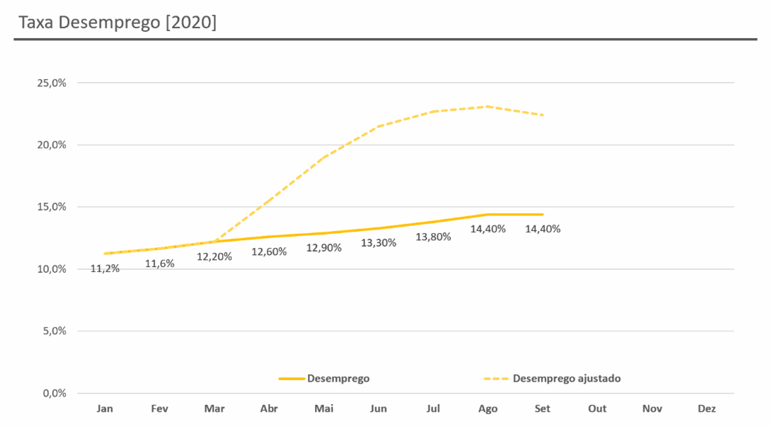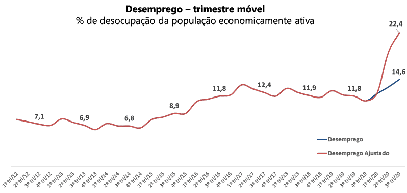 Ao entendermos a metodologia que é utilizada, podemos fazer uma estimativa de qual seria o valor real do desemprego ao recalcularmos o índice utilizando a PEA do mesmo período de 2019, assumindo que as pessoas que procuravam emprego há um ano voltarão ao mercado após a normalização do cenário da Covid-19. Ao aumentarmos o número de desempregados e da PEA em 9,7 milhões (pessoas que deixaram o mercado de trabalho como demonstrado no gráfico acima), o desemprego recalculado passa a ser: