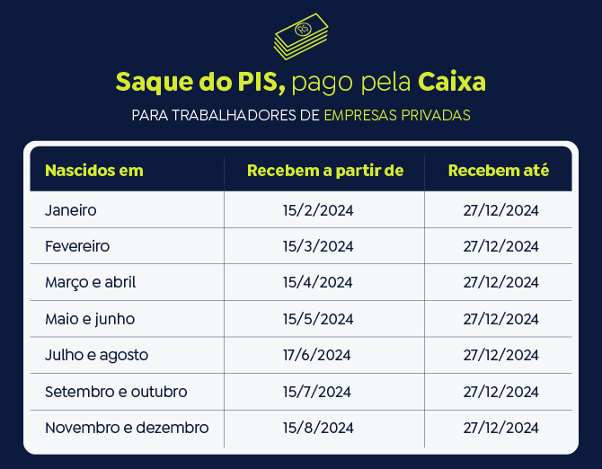 O PIS é pago pela Caixa Econômica Federal e o Pasep, pelo Banco do Brasil. Como ocorre tradicionalmente, os pagamentos serão divididos em seis lotes, baseados no mês de nascimento, no caso do PIS, e no número final de inscrição, no caso do Pasep. O saque iniciará nas datas de liberação dos lotes e acabarão em 27 de dezembro de 2024. Após esse prazo, será necessário aguardar a convocação especial do Ministério do Trabalho e Previdência.