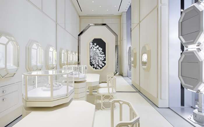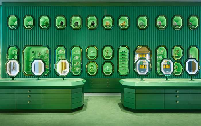 A flagship de Milão cria a sensação de entrar em uma “caixa de joias” luxuosa, com as quatro cores exclusivas da marca — rosa, amarelo, verde e azul — integradas por toda a loja, oferecendo um ambiente visualmente dinâmico e distinto, diferente das lojas tradicionais com um esquema de cores único.