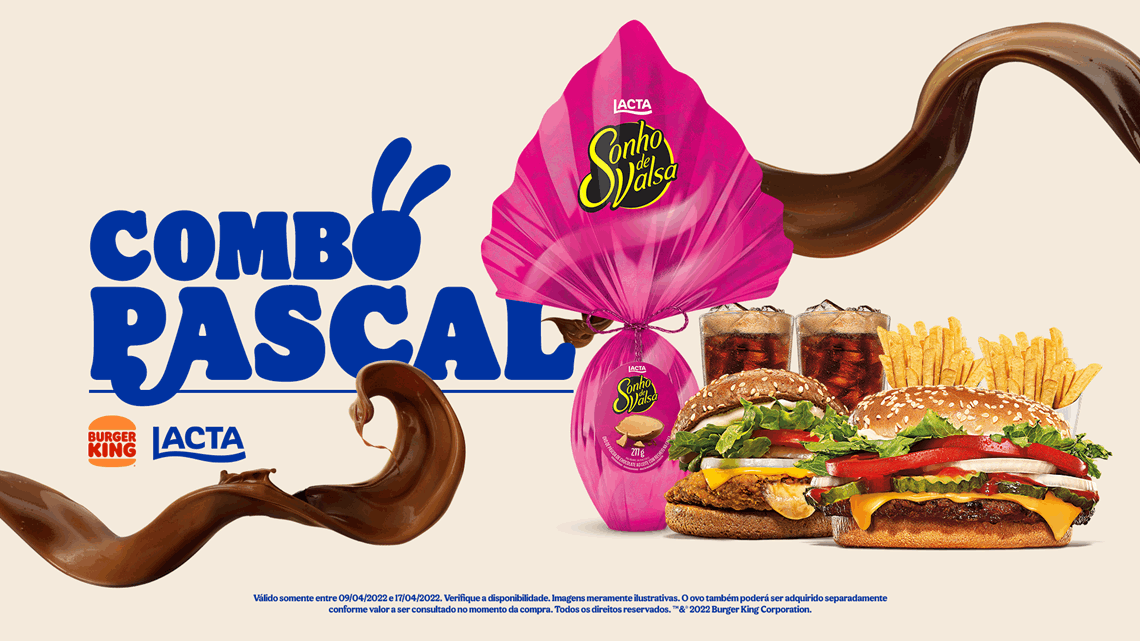 De olho nas comemorações da Páscoa, a rede de fast-food Burger King se uniu à Lacta, marca pertencente à Mondelëz, para lançar um combo especial em comemoração à data, o combo Pascal, que acompanha um ovo de Páscoa do Sonho de Valsa de 277g. A promoção será válida em seis unidades da rede na cidade de São Paulo, e somente no dia 9 de abril, sábado.