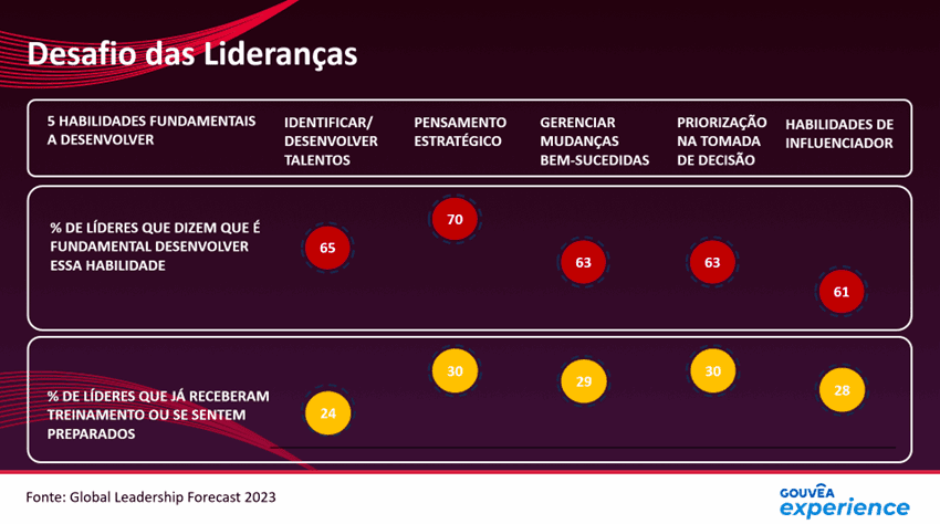 A imagem com o título “Desafio das lideranças” ilustra o resumo de uma pesquisa realizada com mais de 13 mil CEOs, homens e mulheres de mais de 24 diferentes segmentos, cobrindo os macromercados mundiais. Fato é que os líderes que hoje estão à frente das empresas, sabem o que é importante, mas ainda se sentem pouco preparados para isso.