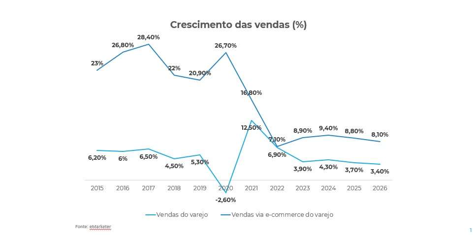 - O ponto de inflexão projetado para pós-2022, onde as taxas de crescimento de vendas do varejo via e-commerce reduzem de forma significativa.