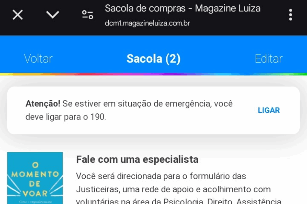 Mesmo próximas ao agressor, as usuárias podem acessar a opção “Configurações” no menu lateral do aplicativo. Em seguida, basta clicar em “Portal de denúncias e violência contra a mulher”. O funcionamento segue o mesmo fluxo do botão de denúncias do app do Magalu, que simula um carrinho de compras com três canais de acolhimento.