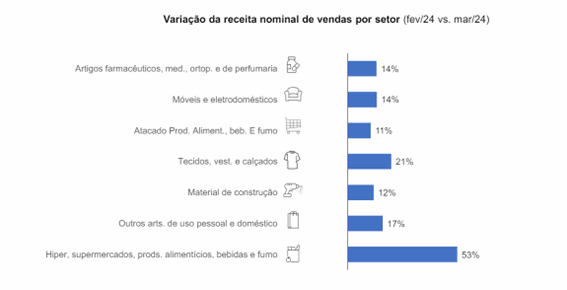 Voltando ao que mencionamos anteriormente, a variação da receita nominal mensal (sem descontar a inflação) das vendas de fevereiro para março, em todos os setores, foi positiva, conforme abaixo: