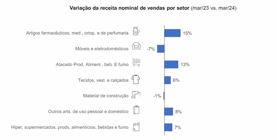 Apesar de todos estes indicadores positivos, a intenção de consumo das famílias recuou 0,8% em março. Se compararmos o desempenho com o mesmo mês do ano passado, em valores nominais, sem desconto da inflação, alguns setores apresentaram dificuldades, como o de móveis e eletrodomésticos e materiais de construção, enquanto outros mantêm significativo crescimento, tal como o registrado nos setores de artigos farmacêuticos e atacado de produtos alimentares.