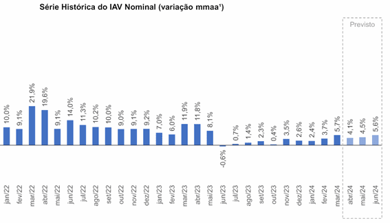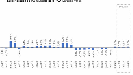 Com esse crescimento, o IAV, ajustado pelo IPCA, ficou positivo em 1,7% em março: maior nível em 10 meses. As previsões para os próximos meses são positivas, de 0,5% para abril; 0,9% para maio/24; e 1,7% para junho.
