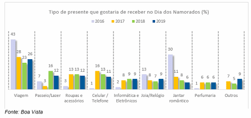 Em primeiro lugar, assim como em 2018, com 30%, aparecem os itens de vestuário, seguidos por jantar romântico, show e cinema (19%); perfumaria (13%); joia ou relógio (10%); celulares e smartphones (9%); informática (8%); viagem romântica (7%); flores (2%), e chocolates (2%).
