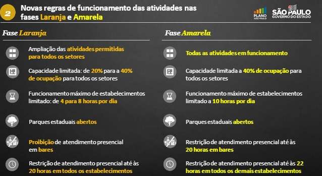 A fase amarela passará a permitir 40% de ocupação presencial para todas as atividades liberadas, incluindo parques estaduais, e expediente de até dez horas diárias. O atendimento presencial terá de ser encerrado às 22h em todos os setores. Nos bares, as portas devem fechar ao público mais cedo, às 20h. Atividades não essenciais que geram aglomeração, como festas, baladas e shows, continuam proibidas.