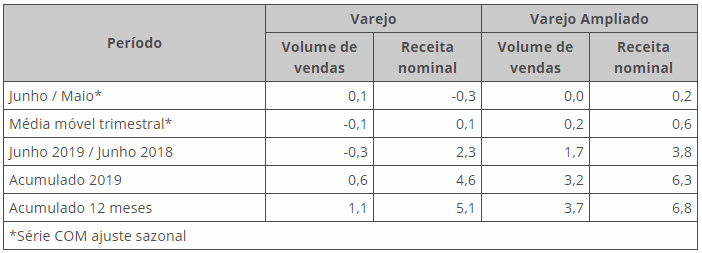 De acordo com levantamento do IBGE, em junho de 2019, o volume de vendas do comércio varejista ficou praticamente estável, com variação de 0,1% frente ao mês imediatamente anterior, na série com ajuste sazonal.