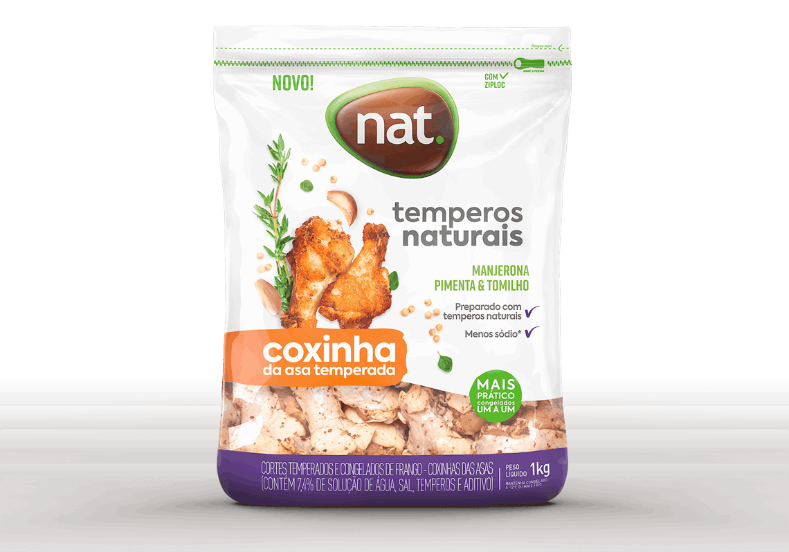 Para o lançamento da nova linha Nat Temperos Naturais, a marca apresenta a versão que tem como principais ingredientes a manjerona, a pimenta e o tomilho. O produto está disponível em quatro cortes de frango: filé de peito fatiado, filezinho, coxinha da asa e frango a passarinho. Todos são congelados um a um (IQF) e distribuídos em embalagens de 1kg.