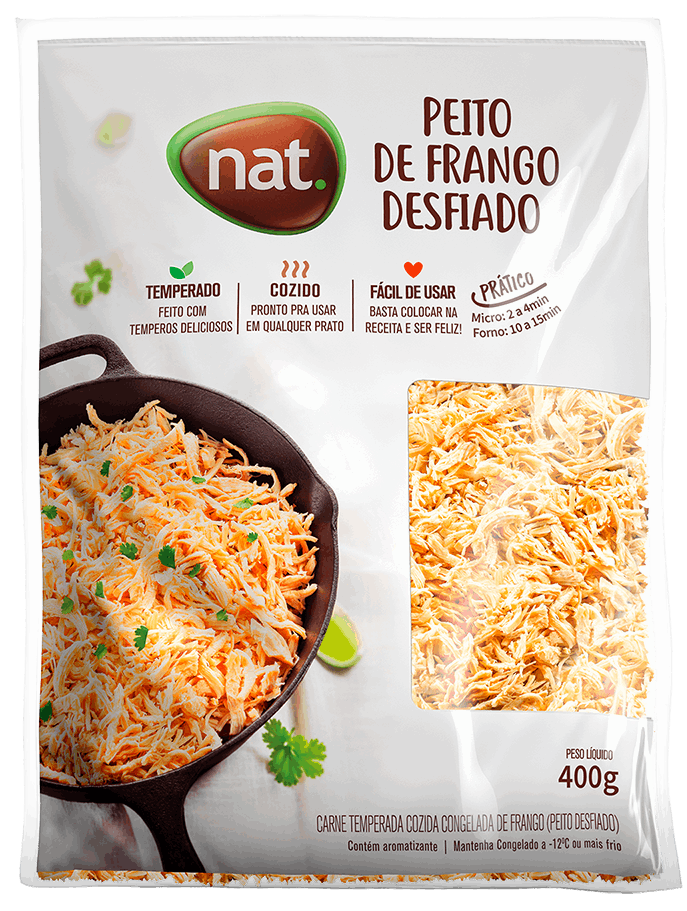 Produzido com 100% de filé de peito, o Frango Desfiado Nat já vem cozido com temperos selecionados. Além de agradável ao paladar, trata-se de uma linha prática para o cotidiano: para ser finalizada, basta aquecer entre 10 e 18 minutos no forno convencional, ou em até três minutos no micro-ondas. Está disponível em embalagens de 400g e 2kg.