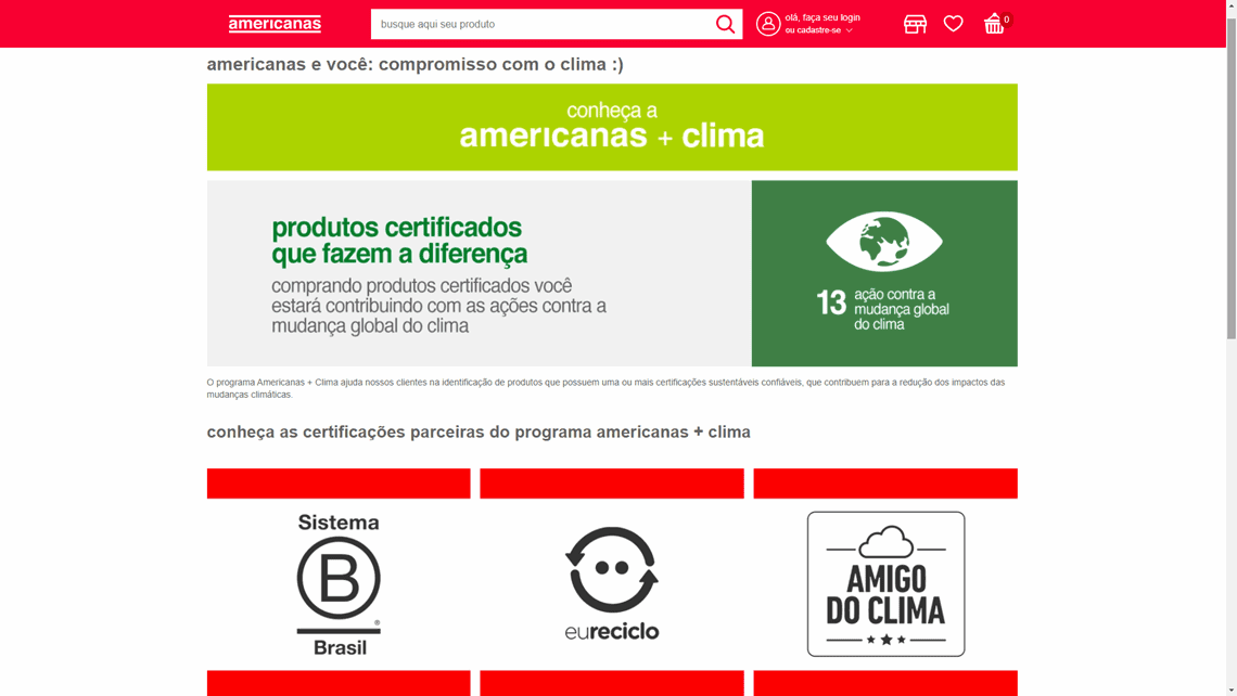 Com foco de alertar e informar o cliente final a favor do consumo sustentável, a Americanas S.A. lançou a plataforma Americanas + Clima. A página especial já está disponível no app e no site da Americanas e conta com mais de mil produtos registrados.