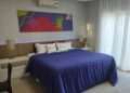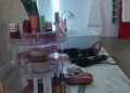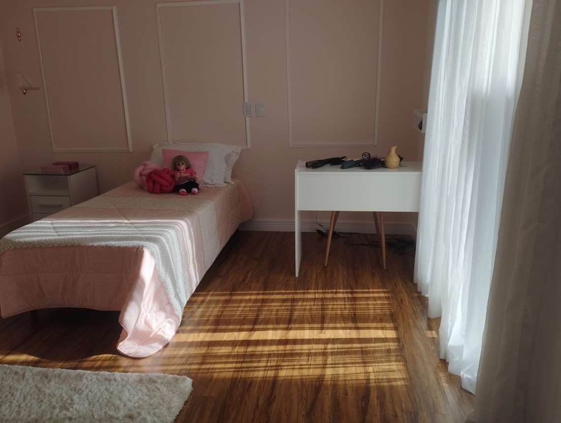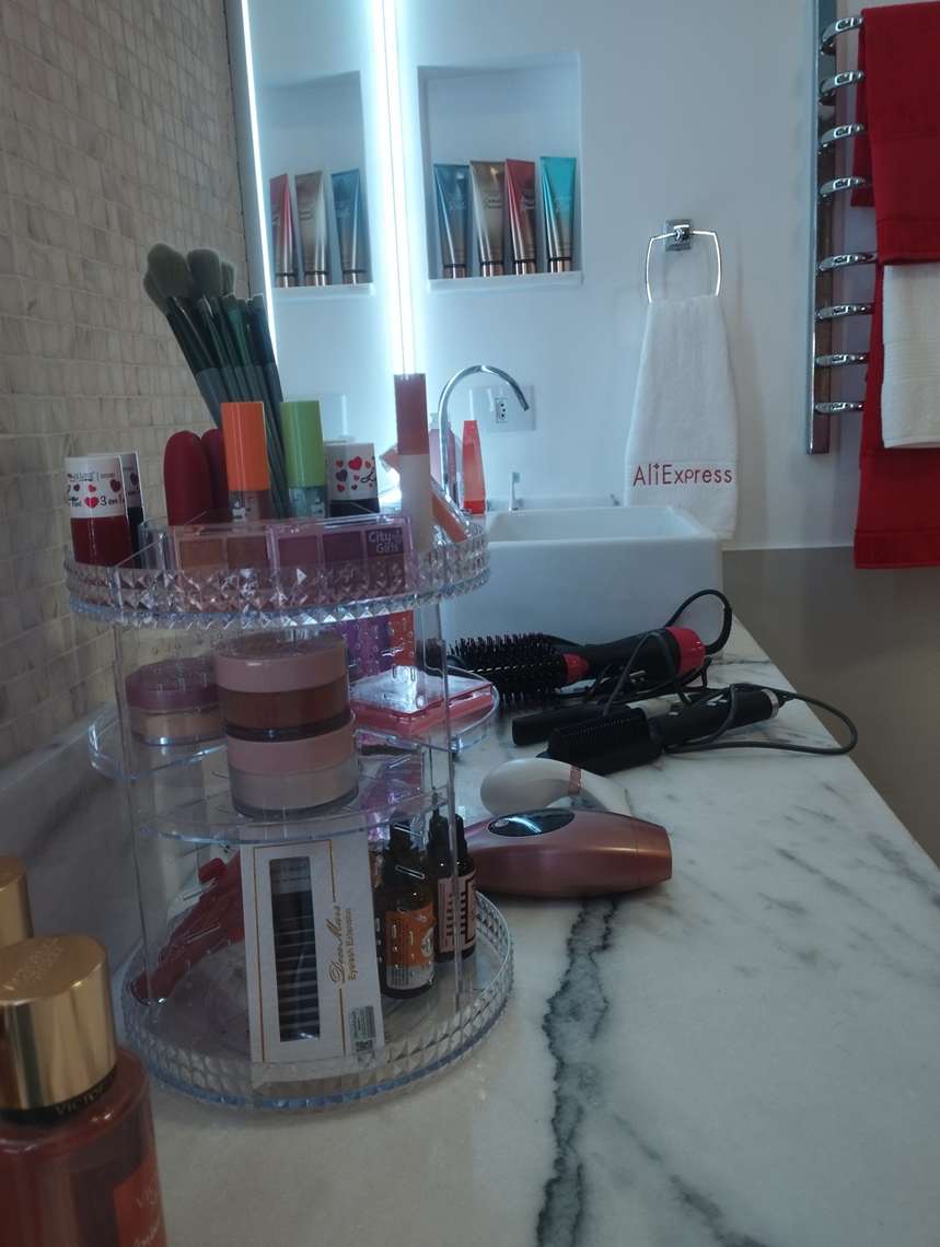 Luzes de led deixam o ambiente com um tom azulado, enquanto, no teto, pontos amarelados brilham como estrelas. No quarto beauty, prevalece o rosa suave combinado à cor branca. O cômodo destina-se à produção de conteúdos voltados para cabelo e maquiagem. Na suíte, o banheiro ganha especial atenção com a bancada repleta de produtos de maquiagem e cuidado pessoal voltados para o público feminino. Mas também existem opções para os homens, como aparadores de cabelo.