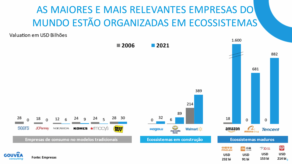 A ascensão de negócio a ecossistema, no entanto, envolve muitas relações internas e externas, e que se atinjam arranjos harmônicos para que se conquiste um valor maior do que se teria individualmente.