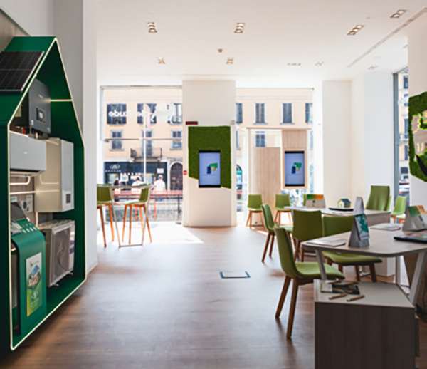 Agora uma empresa de benefícios, a Plenitude impulsiona a adoção de energia renovável, oferecendo painéis fotovoltaicos, soluções de carregamento de veículos elétricos e iniciativas neutras em carbono. A loja tradicional, antes um simples escritório de atendimento ao cliente, transformou-se na “Casa Plenitude”. Esses espaços modernos combinam vendas com consultoria especializada, ajudando os clientes a adotar soluções mais verdes para um futuro mais sustentável.