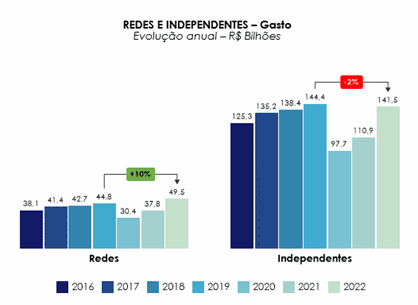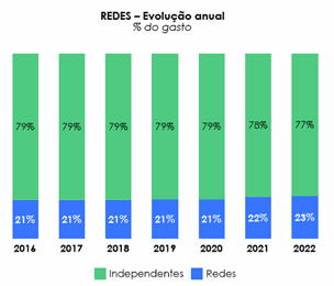 Além do forte potencial de desenvolvimento e expansão de redes no Brasil, ainda aquém do verificado em mercados maduros como o norte-americano, as redes de forma geral têm mostrado um desempenho superior ao dos operadores independentes. Enquanto estes estão aquém dos níveis pré-pandemia em termos de gasto, as redes já operam acima.
