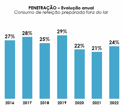 Em 2019, a penetração do setor atingiu 29%, muito aquém de mercados desenvolvidos como Estados Unidos, mas foi um recorde histórico no Brasil, mostrando todo o potencial de crescimento que o setor ainda tem no País. A penetração caiu ao longo da pandemia. Está se recuperando, mas de forma lenta, mostrando que existe espaço para crescimento e expansão dos negócios do foodservice.