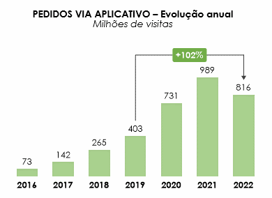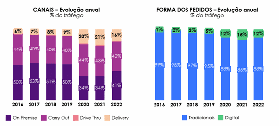 Em 2022, pedidos via delivery já representavam 16% do tráfego do setor, após ter atingido seu pico, de 21%, em 2021. Um salto expressivo, já que em 2019 era apenas 9%. Pedidos digitais (via aplicativo ou site) também mostraram uma evolução rápida, representando 12% do tráfego total do setor em 2022 – e já são o dobro do pré-pandemia.