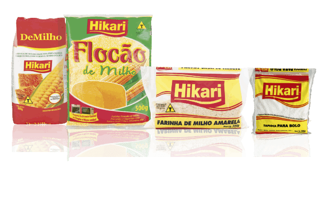 Linhas de Farináceos: farinha de milho, flocada e pré-cozida; Flocão, farinha flocada de milho; farinha de milho amarela e tapioca para bolo.