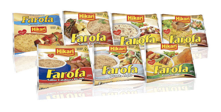 Linha de Farofas: de Calabresa Picante, de Costela, de Carne Seca, com Batata Palha, de Mandioca Pronta, de Milho com Uva Passa, Pronta de Milho e Pronta Light.