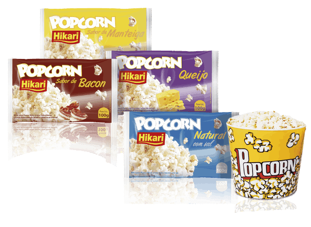 Pipocas para micro-ondas nos sabores natural, bacon, manteiga, queijo e sem gordura.