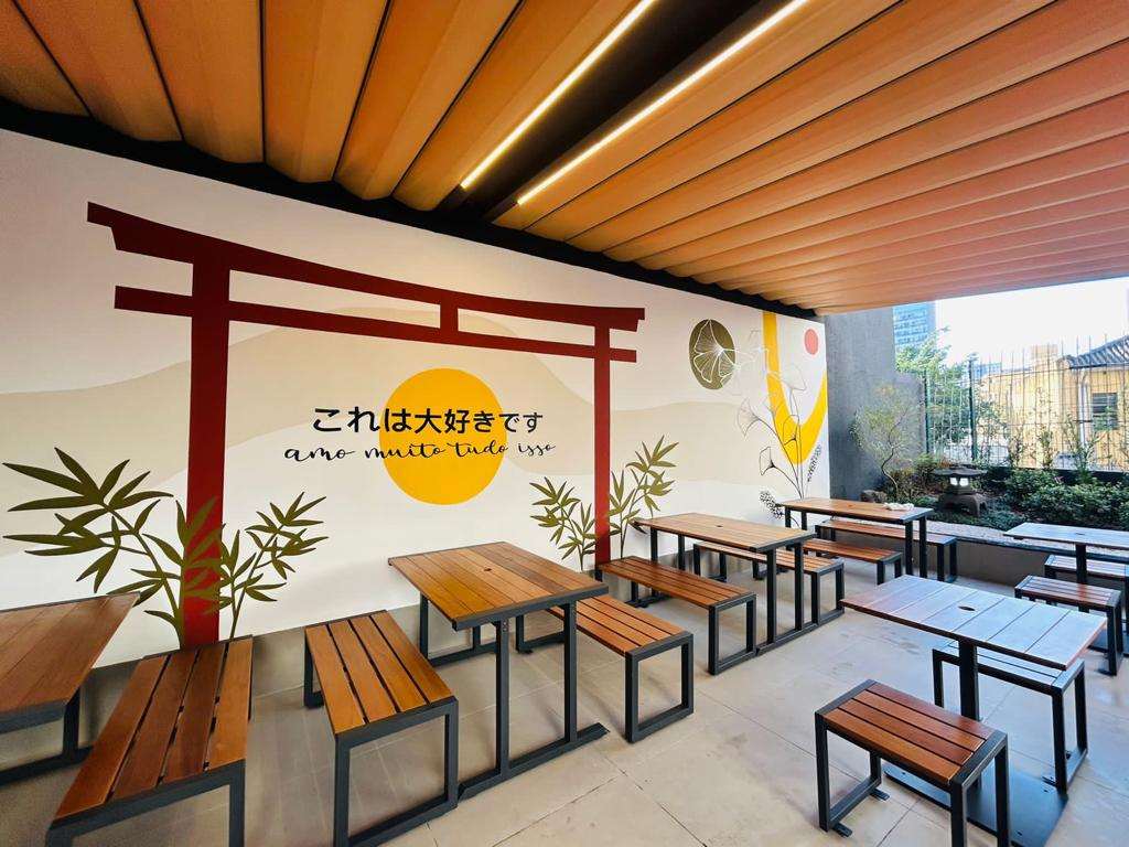 Inspirada em ícones da arquitetura oriental, a fachada do restaurante recebeu ideogramas com a assinatura da marca McDonald’s. A área externa é ambientada em um jardim que conta com uma árvore cerejeira, além de um grafite que retrata símbolos da cultura, como as lanternas e o Torri, portão tradicional japonês.