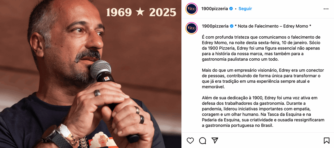 “Mais do que um empresário visionário, Edrey era um conector de pessoas, contribuindo de forma única para transformar o que já era tradição em uma experiência sempre atual e memorável. Edrey deixa um legado de paixão, inovação e cuidado, que permanecerá vivo em nossos corações”, afirmou a página da 1900 Pizzeria no Instagram.