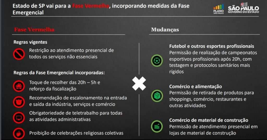 Com o retorno à fase vermelha, São Paulo volta a permitir a retirada de produtos pelo consumidor diretamente nos locais de venda, como comércios, restaurantes e outras atividades, no modelo chamado de take away. O atendimento presencial e a venda no local continuam proibidos em todos os estabelecimentos.