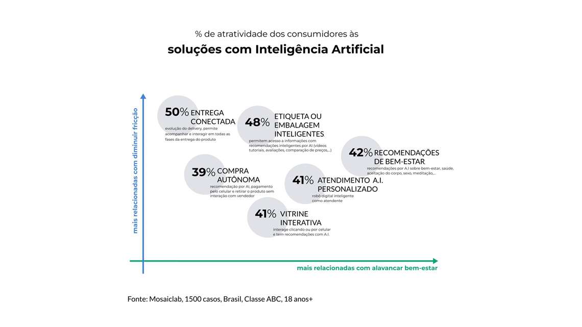 Mapeando a atratividade do consumidor sobre soluções com inteligência artificial, observamos que as que têm mais interesse estão em dois campos: o primeiro são soluções que diminuem fricções relevantes, como as que otimizam tempo e esforço do consumidor, além das que realizam recomendações assertivas e personalizadas.