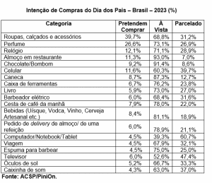 Do grupo de entrevistados que planejam presentar seus pais, 43,2% pretendem gastar mais do que em 2022, enquanto 32,0% desejam o contrário. Em termos do nível de despesa, a grande maioria (78,1%) pretende gastar entre R$ 50 e R$ 250. A pesquisa também apontou que a maioria das compras continuaria sendo realizada em pequenos estabelecimentos (42,4%), e de forma presencial, em lojas físicas (60,9%).