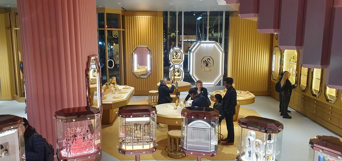 Também centenária, a austríaca Swarovski tem uma loja nova e imponente na 5ª Avenida. É a maior loja da marca, com 1.400 m², distribuídos em dois andares supercoloridos. A arquitetura da loja busca fazer com que os visitantes se sintam dentro de uma caixa de joias gigante. Muito veludo e muita seda são usados no acabamento. O logo octagonal está espalhado pela loja: na fachada, nos nichos, displays, maçanetas e espelhos de mão.