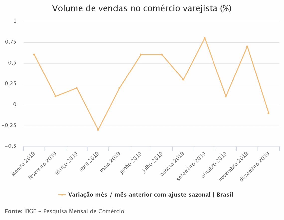 O varejo nacional teve leve retração de 0,1% em dezembro, na comparação com novembro do ano passado, interrompendo sete meses seguidos de avanço nas vendas. No acumulado em 2019, o setor cresceu 1,8% e fechou o terceiro ano consecutivo de taxas positivas, embora tenha havido uma desaceleração em relação a 2017 (2,1%) e 2018 (2,3%).Os dados são da Pesquisa Mensal de Comércio, divulgada hoje (12) pelo IBGE.