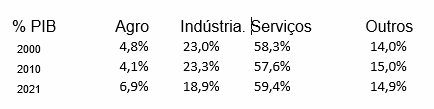 Na realidade brasileira não é diferente, porém, com cores locais, derivadas do forte crescimento do setor agropecuário e da sua importância estratégica para o País, ao mesmo tempo em que o setor industrial sofre pela reconfiguração estrutural da sociedade e da economia, sem falar nas questões das opções próprias desse setor.