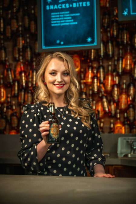Dentro do Butterbeer Bar, os fãs são recebidos por uma cascata gigante de garrafas brilhantes, cada uma com um rótulo colecionável. Os clientes são convidados a provar uma xícara espumosa de cerveja amanteigada servida em uma caneca de souvenir (na verdade, um refrigerante de caramelo) ou um sorvete de cerveja amanteigada refrescante.