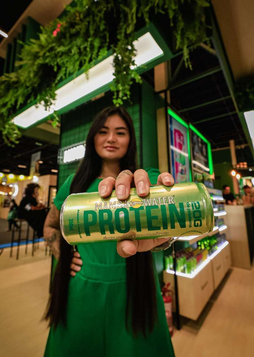 A Better Drinks encheu as geladeiras e gôndolas do bar da Heineken, montado na Naturaltech, com as tradicionais bebidas orgânicas da marca Baer-Matcha e a água na lata com a Mamba Water. Mas a bebida que mais chamou a atenção foi a que não estava disponível para consumo e foi anunciada como o próximo lançamento da startup: a Mamba Water Protein, a água com proteína, que será lançada em três sabores, em latas de 350 ml.
