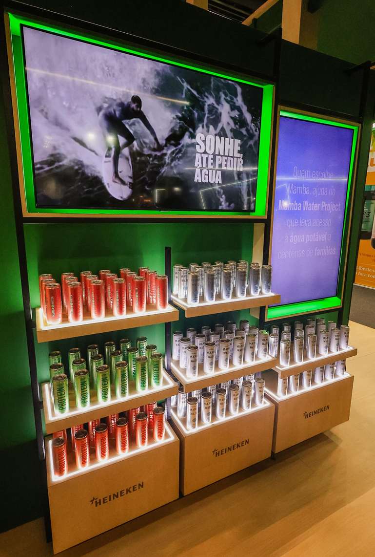 A Better Drinks encheu as geladeiras e gôndolas do bar da Heineken, montado na Naturaltech, com as tradicionais bebidas orgânicas da marca Baer-Matcha e a água na lata com a Mamba Water. Mas a bebida que mais chamou a atenção foi a que não estava disponível para consumo e foi anunciada como o próximo lançamento da startup: a Mamba Water Protein, a água com proteína, que será lançada em três sabores, em latas de 350 ml.