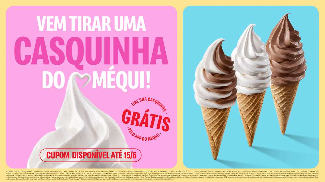 Para garantir a sua casquinha, o cliente deve resgatar o cupom “Casquinha Grátis” no app da marca, limitado a um por CPF. Uma vez resgatado, o cupom pode ser utilizado até 30 de junho no Drive-Thru, no balcão ou nos quiosques de sobremesa do McDonald’s (confira os restaurantes participantes aqui).