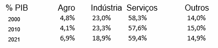 Na realidade brasileira não é diferente, porém, com cores locais, derivadas do forte crescimento do setor agropecuário e da sua importância estratégica para o País, ao mesmo tempo em que o setor industrial sofre pela reconfiguração estrutural da sociedade e da economia, sem falar nas questões das opções próprias desse setor.