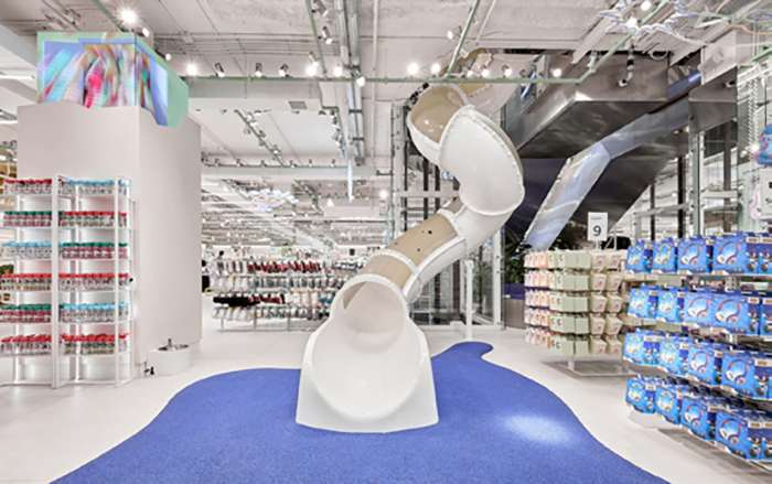 Elementos atraentes, como esculturas instagramáveis e zonas interativas, como o escorregador que conecta os andares, criam espaços que incentivam o compartilhamento social e fazem da Lefties não apenas uma loja, mas um destino comunitário.