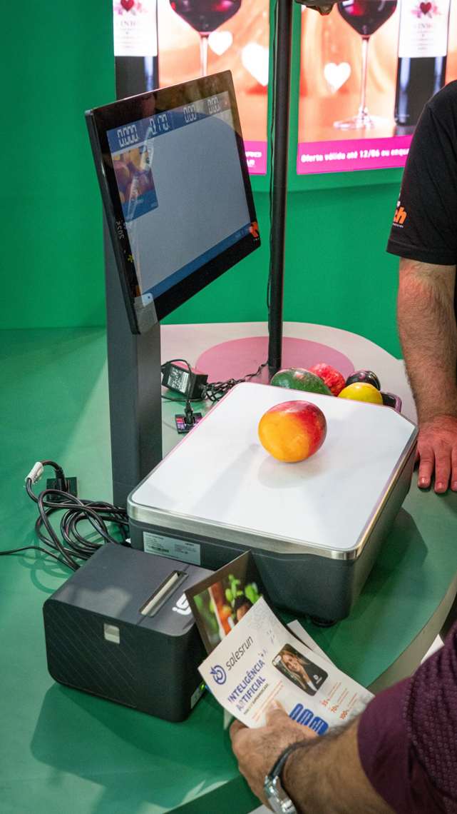 A balança com IA também foi uma das soluções apresentadas na feira — uma tecnologia que busca tornar a experiência do consumidor no supermercado mais autônoma e eficiente. Equipada com uma câmera e operando com sistema Android, a balança identifica o produto colocado sobre ela, realiza a pesagem e imprime a etiqueta com o preço.